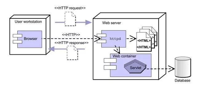 图中的服务器保持了一系列html脚本来响应用户的请求,可以说这个时期的web应用还是比较简单的,但是却确立了两个重要的对象:一个request(代表请求),另一个是response(代表回应)。